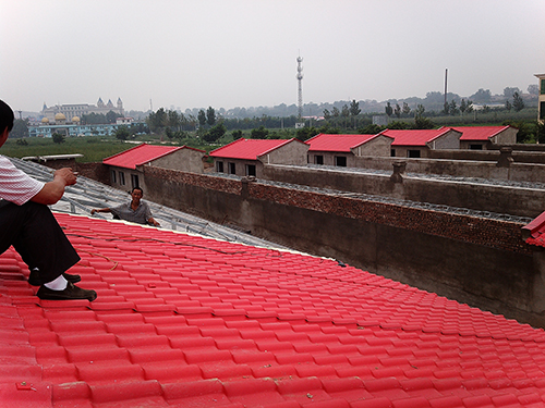二、屋面与女儿墙体交接处的泛水。用金属板或合成树脂板根据现场尺寸加工定制泛水型板,一端用射钉固定在墙面上,另一端固定在瓦波上。